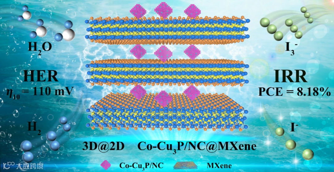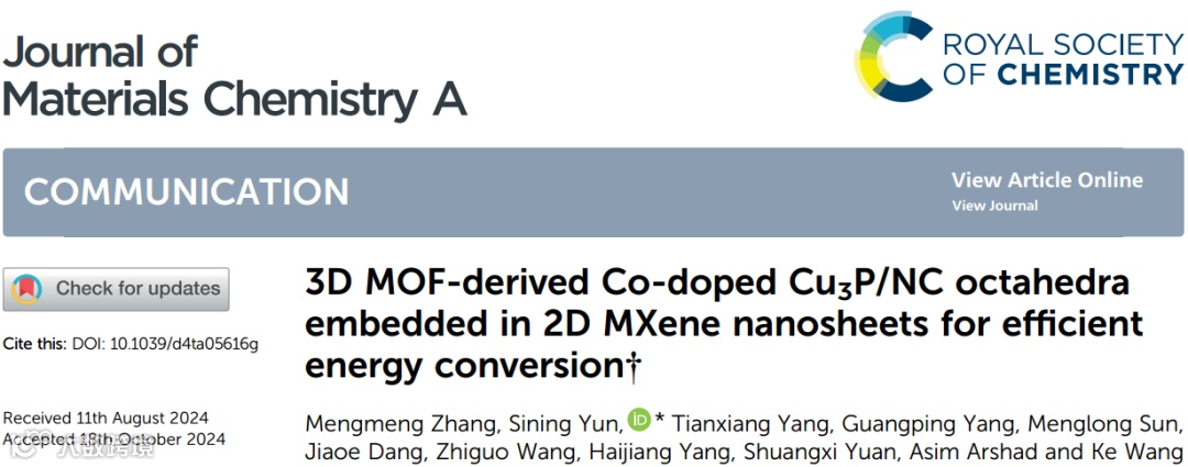 近日,西安建筑科技大学云斯宁教授团队在国际知名期刊《Journal of Materials Chemistry A》上发表了题为“3D MOF-derived Co-doped Cu₃P/NC octahedra embedded in 2D MXene nanosheets for efficient energy conversion”的研究文章。该研究通过原位生长策略设计了一种独特的3D@2D结构催化剂(Co-Cu₃P/NC@MXene)。该方法巧妙地将MOF衍生的Co-Cu₃P/NC八面体嵌入到MXene的层间空隙中,创造了有利于加速电子传输的微观环境。同时,Co的引入调节了Cu₃P的电子结构,显著提升了Co-Cu₃P/NC@MXene催化剂的电化学活性。3D Cu₃P/NC与2D MXene构建的分级有序结构为Co-Cu₃P/NC@MXene提供了丰富的电子转移通道,在电解水制氢和太阳能电池中均展现出卓越的电催化性能。在10 mA cm⁻²的电流密度下,实现了较小的过电位(110 mV)和较低的塔菲尔斜率(62 mV dec⁻¹);在新一代太阳能电池中,实现了8.18%光电功率转换效率。
