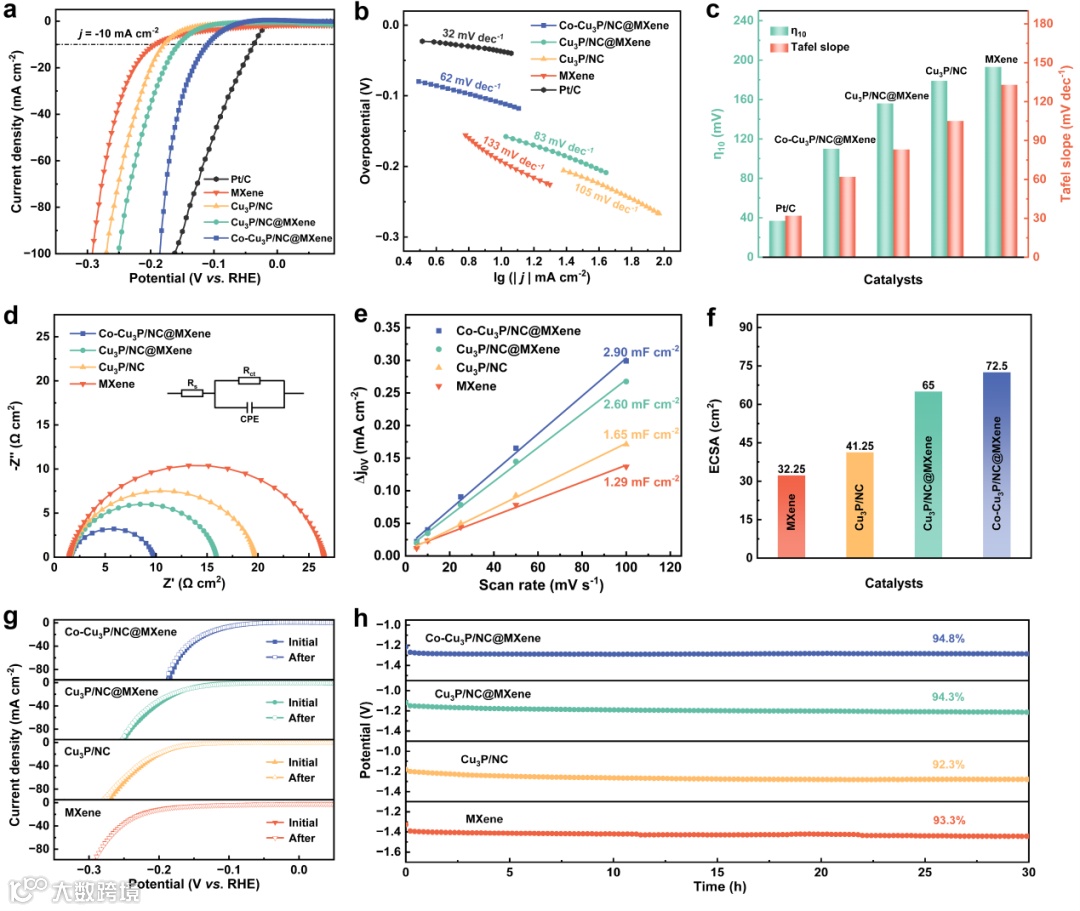 图 3. HER电催化:(a)LSV曲线。(b)塔菲尔图和(c)对应的η10和塔菲尔斜率值。(d)奈奎斯特图(插图:相应的等效电路)。催化剂析氢反应的(e)Cdl和(f)ECSA。1000次CV循环前后的LSV曲线(g)以及CP曲线(h)。