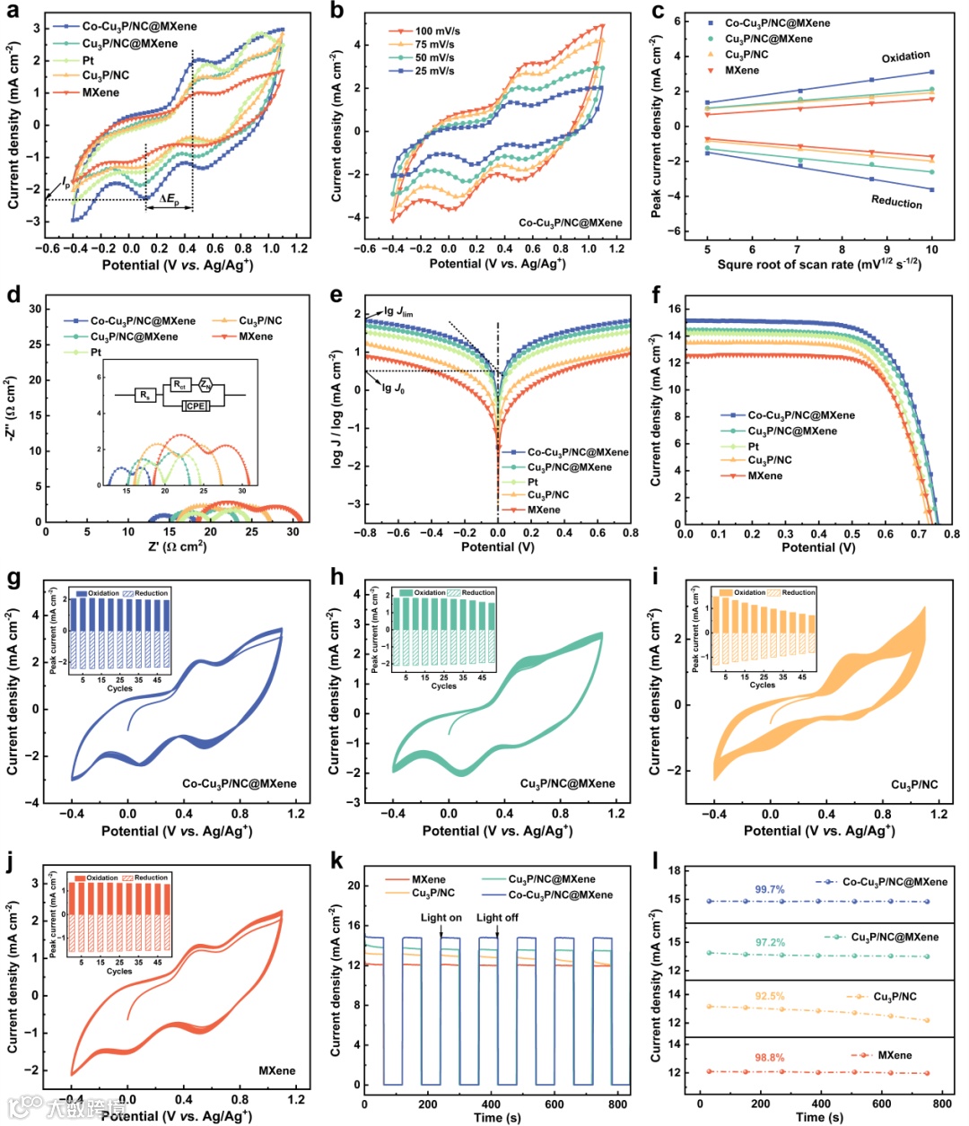 图4. IRR电催化:(a)CV曲线。(b)不同扫描速率下的CV曲线。(c)扫描速率的平方根与峰值电流密度之间的线性关系图。(d)奈奎斯特图和(e)塔菲尔极化曲线图。(f)太阳能电池的J-V特性曲线。在50 mV s-1扫描速率下,连续50个周期的CV稳定性扫描曲线图,(g)Co-Cu3P/NC@MXene、(h)Cu3P/NC@MXene、(i)Cu3P/NC和(j)MXene。太阳能电池的光响应测试(k)和稳定性测试(l)。