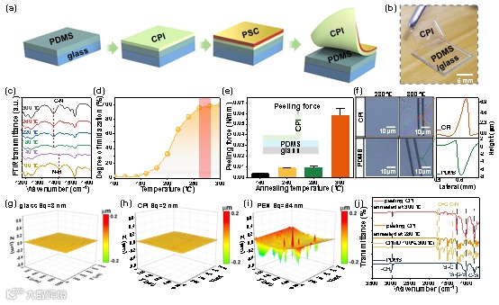 图2. 无色透明聚酰亚胺(CPI)基材及超薄钙钛矿太阳能电池(UTPSCs)的制备。(a) UTPSCs的制造过程示意图。(b)从PDMS/玻璃上剥落的超薄CPI的照片。(c)不同温度下CPI薄膜的FTIR光谱。(d)透明聚酰亚胺的环化程度。(e)不同温度下与PDMS粘合的CPI平均剥离强度。每种样品重复五次,误差条表示标准偏差。(f)光学显微镜图像CPI和PDMS及其粗糙度统计。(g-i)3D光学显微镜图像,(g)玻璃,(h)CPI和(i)PEN基板。(j)不同退火温度下的CPI和PDMS薄膜的FTIR光谱
