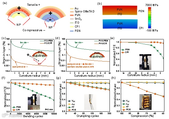 图5. 超薄柔性钙钛矿太阳电池(UTPSCs)的机械稳定性。(a) 在弯曲过程中,位于PEN和CPI基底上的PSCs的示意图,其中虚线表示结构的中性平面。(b) 使用Abaqus模拟,在1毫米弯曲半径下,基于PEN和CPI基底的PSCs中的应力分布。(c) 弯曲半径对使用PEN和CPI基底的PSCs中氧化铟锡(ITO)层应变的影响。(d) 弯曲半径对使用PEN和CPI基底的PSCs中钙钛矿层应变的影响。(e) 在循环测试后,随着弯曲半径变化,柔性PSCs的光电转换效率(PCE)保持率。(f) 在3毫米弯曲半径下,随着弯曲循环次数增加,柔性PSCs的PCE保持率。(g) 随着扭折循环次数增加,UTPSCs的PCE保持率。(h) 在压缩测试期间,UTPSCs的太阳电池性能。