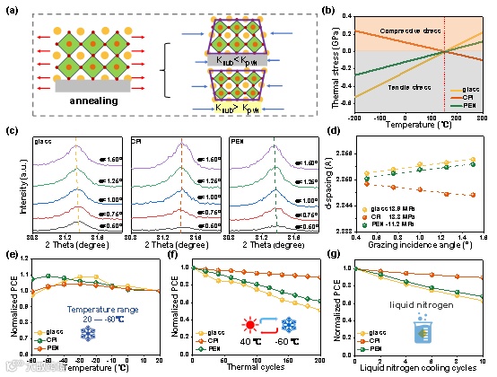 图6. 超薄柔性钙钛矿太阳电池(UTPSCs)的温度循环稳定性。(a) 由于基板热膨胀差异导致PSCs中热应力的概念图。(其中Ksub和Kpvk分别代表基板和钙钛矿薄膜的热膨胀系数。)(b) 在不同温度下,不同基板上钙钛矿层的热应力计算。(c) 沉积在不同基板上的钙钛矿薄膜的广角X射线表面散射(GIXRD)图谱。(d) 钙钛矿(211)晶面的d间距值随X射线入射角的变化。(e) 基于不同基板的PSCs的温度依赖性光电转换效率(PCE)。(f) 经过温度循环测试(40至-60°C)后,不同基板上PSCs的PCE退化情况。(g) 利用液氮淬火进行极端热冲击测试后的PCE退化情况。