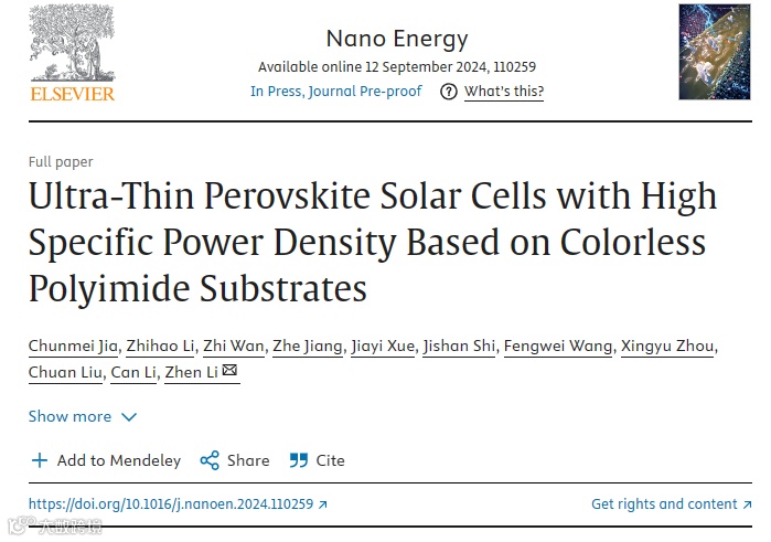 近日,来自西北工业大学李祯教授课题组在Nano Energy上发表题为“Ultra-Thin Perovskite Solar Cells with High Specific Power Density Based on Colorless Polyimide Substrates”的研究论文。该论文分析了当前超薄钙钛矿太阳能电池在效率上存在的不足及其原因,提出了原位制备超薄CPI基底提升超薄柔性电池的新方法,并验证了其在极端温度变化下的稳定性,展望了其在未来高性能、轻量化应用中的潜力。论文的第一作者是西北工业大学博士研究生贾春媚。