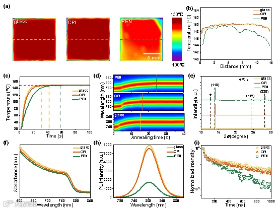 图3. 在不同基底上的钙钛矿薄膜沉积。(a) 红外图像显示在150°C退火最初的60秒内不同基材的温度分布。(b) 从红外图像中虚线位置获得的温度曲线。(c) 不同基底的表面温度随退火时间的变化。虚线指示的是达到平衡的时间。(d) 在不同基材上沉积的钙钛矿薄膜的原位光致发光(PL),显示从中间相转变为钙钛矿相的过渡时间。(e) 在不同基底上沉积的钙钛矿薄膜的X射线衍射(XRD)图谱。(f) 分别在玻璃、CPI和PEN上沉积的钙钛矿薄膜的紫外-可见(UV-vis)吸收光谱。(h) 在405nm光照激发下基于玻璃、CPI和PEN基底的钙钛矿薄膜的光致发光(PL)光谱。(i) 基于玻璃、CPI和PEN基底的钙钛矿薄膜的时间分辨光致发光(TRPL)光谱。