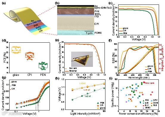 图4. 基于不同基底的PSCs(钙钛矿太阳能电池)的器件性能。(a) 超薄柔性PSCs的器件结构;(b) UTPSCs(超薄钙钛矿太阳能电池)的截面扫描电子显微镜(SEM)图像;(c) 基于不同基底的PSCs的典型J-V(电流-电压)曲线。(d) 基于不同基底的20个独立器件的光电转换效率(PCE)统计数据。(e) 面积为1.0平方厘米的大面积UTPSC的典型J-V曲线。(f) PSCs的外部量子效率(EQE)光谱和积分电流密度。(g) 只具有电子传输结构ITO/SnO2/钙钛矿/PCBM/Ag的钙钛矿薄膜的空间电荷限制电流。(h) 基于不同基底的PSCs的开路电压(VOC)与光照强度的关系。(i) 超薄太阳能电池的PCE和WSPD(重量比功率密度)的总结和比较。