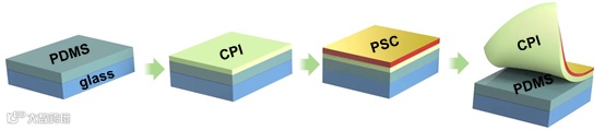 图1. 无色聚酰亚胺(CPI)基底及超薄钙钛矿太阳能电池(UTPSCs)的制备方案。