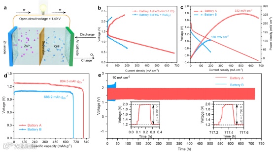 所得的FeCo-N-C-1.25双功能催化剂被负载在镍泡沫上,用于制备ZABs的空气电极(图5a,命名为电池A)。为对比,还研究了一种使用Pt/C和RuO₂混合物作为催化剂的对照电池(电池B)。电池A的充放电极化曲线之间的电压差较小,表明其具有优异的充放电性能(图5b)。电池A的最大功率密度为332 mW cm⁻²,远高于电池B的144.3 mW cm⁻²,也超过了大多数已报道的ZAB系统。电池A的比容量为804.5 mAh g⁻¹(10 mA cm⁻²),反映了锌的高利用效率,比电池B高约17%(图5d)。经过超过720小时的连续充放电操作后(图5e),电势差仅出现微小增加,表明该电池在氧电催化方面具有显著的稳定性和可逆性。这些结果强调了所提出策略在开发高效催化剂以应用于ZABs及相关能量转换装置中的巨大潜力。