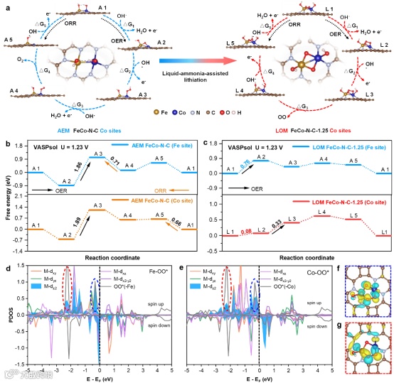 图4. OER中AEM到LOM转变验证。a) OER机制,即AEM(左)和LOM(右)。A1和L1分别是AEM和LOM的OER起始点。b) FeCo–N–C和c) FeCo–N–C-1.25催化剂中OER(从左到右)和ORR(从右到左)中间体的自由能。d, e) L2中O p轨道和Fe/Co d轨道的部分态密度(PDOS)。f, g) 显示M dz2轨道和O p轨道之间重叠的波函数,分别对应面板d、e中的蓝色虚线圆和面板d、e中的红色虚线框。