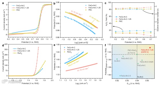 为验证C–N键配位调控对催化活性的影响,评估了电催化ORR性能。图3a-c显示,FeCo–N–C-1.25具有最高的起始电位(1.070 V)和半波电位(0.853 V)、最小的Tafel斜率(41.75 mV dec⁻¹)、最低的H₂O₂生成率(约9.6%)及最高的电子转移数(3.82)。在OER性能中(图3d、3e),FeCo–N–C-1.25的过电位为295 mV(η10),Tafel斜率为61.18 mV dec⁻¹,均优于FeCo–N–C。图3f表明,FeCo–N–C-1.25的ΔE仅为0.672 V,展现其在ZABs中的巨大潜力。