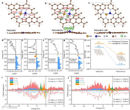 图1. DFT计算。a) FeCo–N–C模型和Bader电荷分布,b) FeCo–N–C/Li模型和Bader电荷分布。c) FeCo–N–C-1.25模型,其中五元C-N键在与Li反应后被破坏。棕色、白色、黄色、蓝色和绿色球体分别代表C、N、Fe、Co和Li原子。d) FeCo–N–C中六元C–N键的COHP曲线,e) FeCo–N–C中五元C–N键的COHP曲线,f) FeCo–N–C/Li中六元C–N键的COHP曲线,g) FeCo–N–C/Li中五元C–N键的COHP曲线。负COHP值的区域(蓝色)表示成键态;而正COHP值的区域(橙色)表示反成键态。h) 上述四种C-N键的键级。i) FeCo–N–C模型的PDOS图,j) FeCo–N–C-1.25模型的PDOS图。