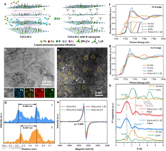图2. 结构和形貌表征。a) LAAL裁剪FeCo–N–C中的氮原子示意图。b) Fe、Co、C和N元素的TEM图像及能量色散X射线光谱图。c) 扫描透射电子显微镜高角环形暗场(HAADF–STEM)图像。d) 图c中标示的1和2中强度分布图。e) 不同锂化程度下FeCo–N–C催化剂的电子顺磁共振(EPR)谱图。f) Fe foil、FePc、Fe₂O₃和FeCo–N–C-1.25的Fe K边XANES谱图。g) Co foil、Co₃O₄、CoPc和FeCo–N–C-1.25的Co K边XANES谱图。h) FT-EXAFS谱图;插图显示用于拟合的结构模型。