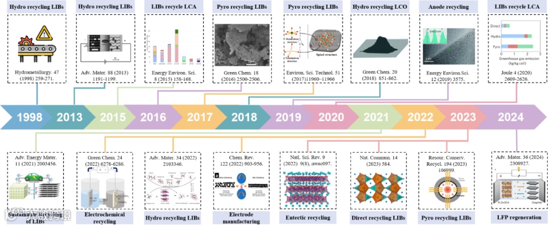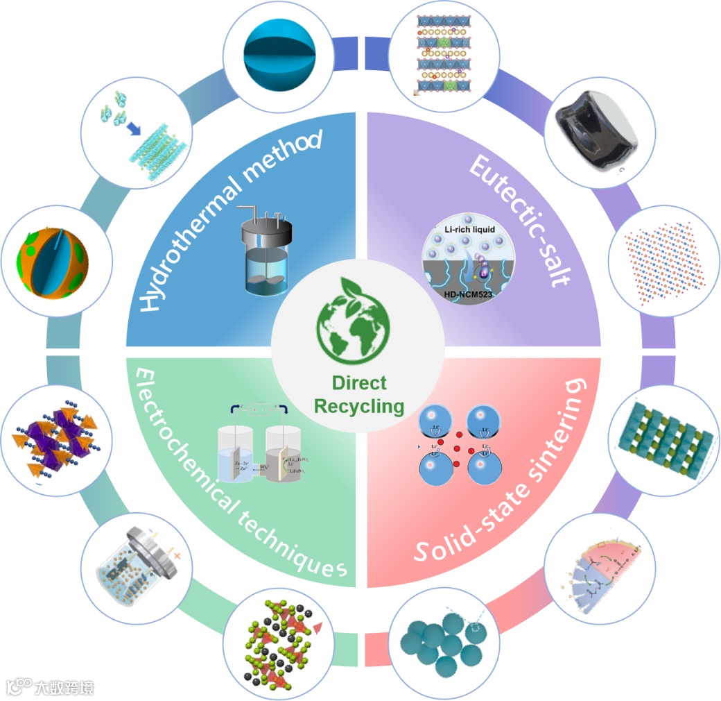 (1) 从不同原材料的适应性、降解程度、废旧材料升级回收的潜在能力等方面,系统地总结了直接再生的四种主流方法和一些最新方法的进展,尤其关注它们在修复电极时的通用性。