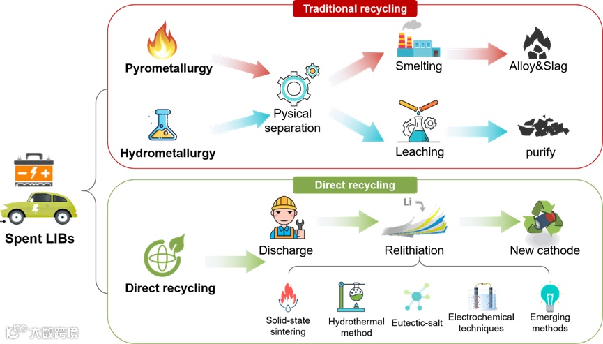 图4. 退役锂离子电池传统回收法与直接再生法的对比图