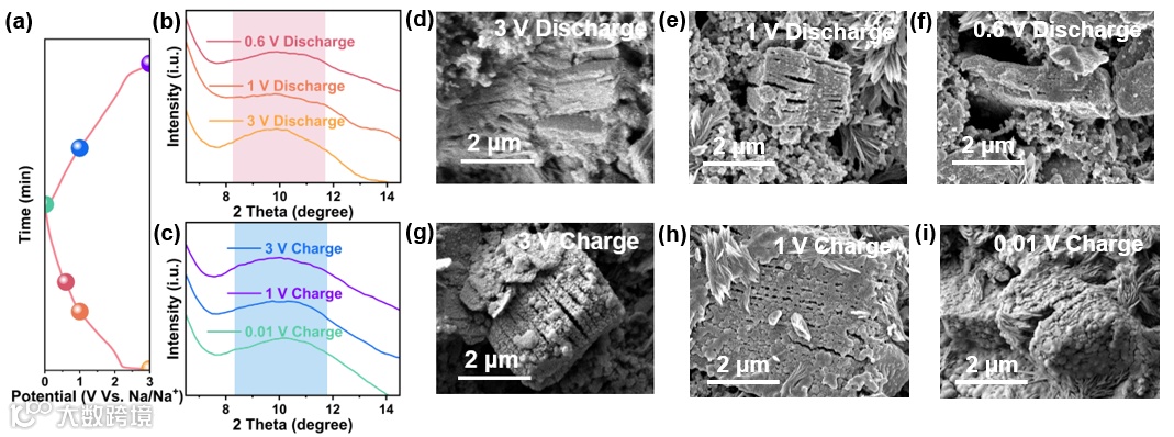图5. 不同电压下MXLD负极的XRD和SEM图像。(a) 电压和工作时间曲线。(b) 放电过程中不同电压下的XRD图谱。(c) 充电过程中不同电压下的XRD图谱。(d-f) 放电过程中不同电压下的SEM图像。(g-i) 充电过程中不同电压下的SEM图像。