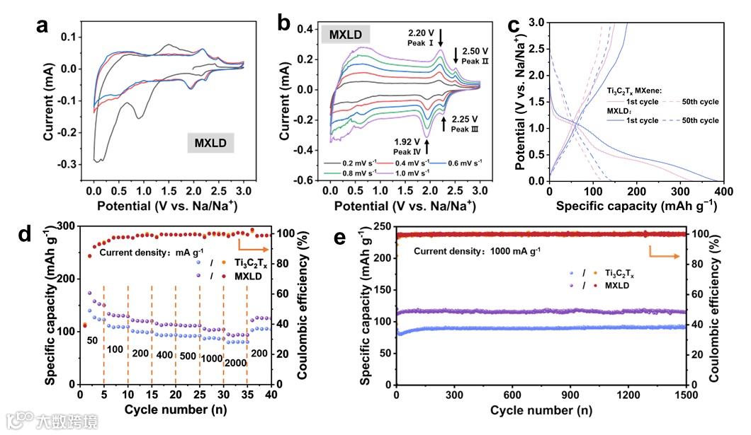 电化学性能测试表明,MXLD在0.2至1 mV s-1扫描速率下,其CV曲线形状保持良好,且在不同充放电倍率下MXLD负极比容量较之Ti3C2Tx MXene有所提升,表明MXLD电极具有良好的倍率性能。在1000 mA g-1下,经过1500次循环后,其容量保持率为94.9%,比容量为114.4 mAh g-1。