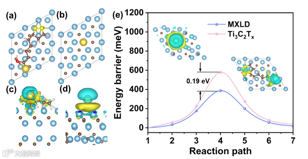 图6. Ti3C2Tx表面的Na+吸附能和MXLD的DFT计算。(a) MXLD和(b) Ti3C2Tx中Na+存储位点的俯视图。(c) MXLD和(d) Ti3C2Tx的电荷分布。(e) NEB计算的Na+在MXLD和Ti3C2Tx中的扩散势垒曲线;电荷密度俯视图:左侧为Ti3C2Tx MXene,右侧为MXLD。