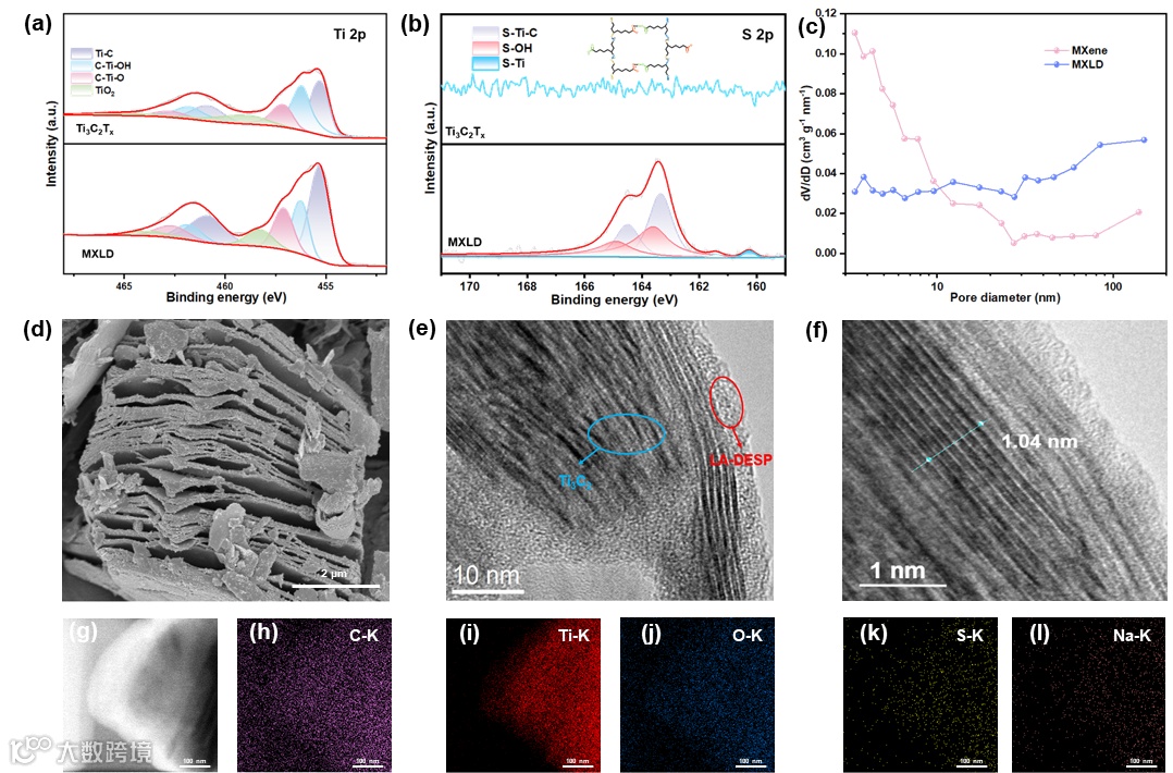 图2. MXLD和Ti3C2Tx结构表征。Ti3C2Tx(上)和MXLD(下)XPS光谱图 (a) Ti 2p光谱图;(b) S 2P光谱图。(c) MXLD和Ti3C2Tx的孔径分布示意图。(d) MXLD横截面的SEM图。(e-f) MXLD横截面的HR-TEM图。(g) MXLD的STEM图。(h-l) C、Ti、O、S 和Na的元素分布图。