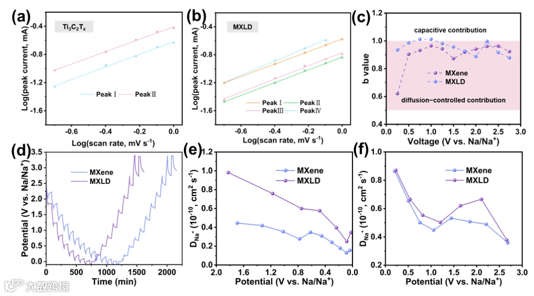 通过对CV曲线的氧化还原峰及不同电位下的电容贡献进行计算,结果表明,MXLD的Na⁺存储动力学过程由电容过程主导,高电容贡献更有利于Na⁺快速存储,表明MXLD具有更快速Na⁺存储能力。GITT测试结果表明,MXLD较之Ti3C2Tx MXene具有更大的DNa+,即通过LA-DESP构建的高效Na⁺路径和跳跃迁移机制,利于Na⁺高效传输。