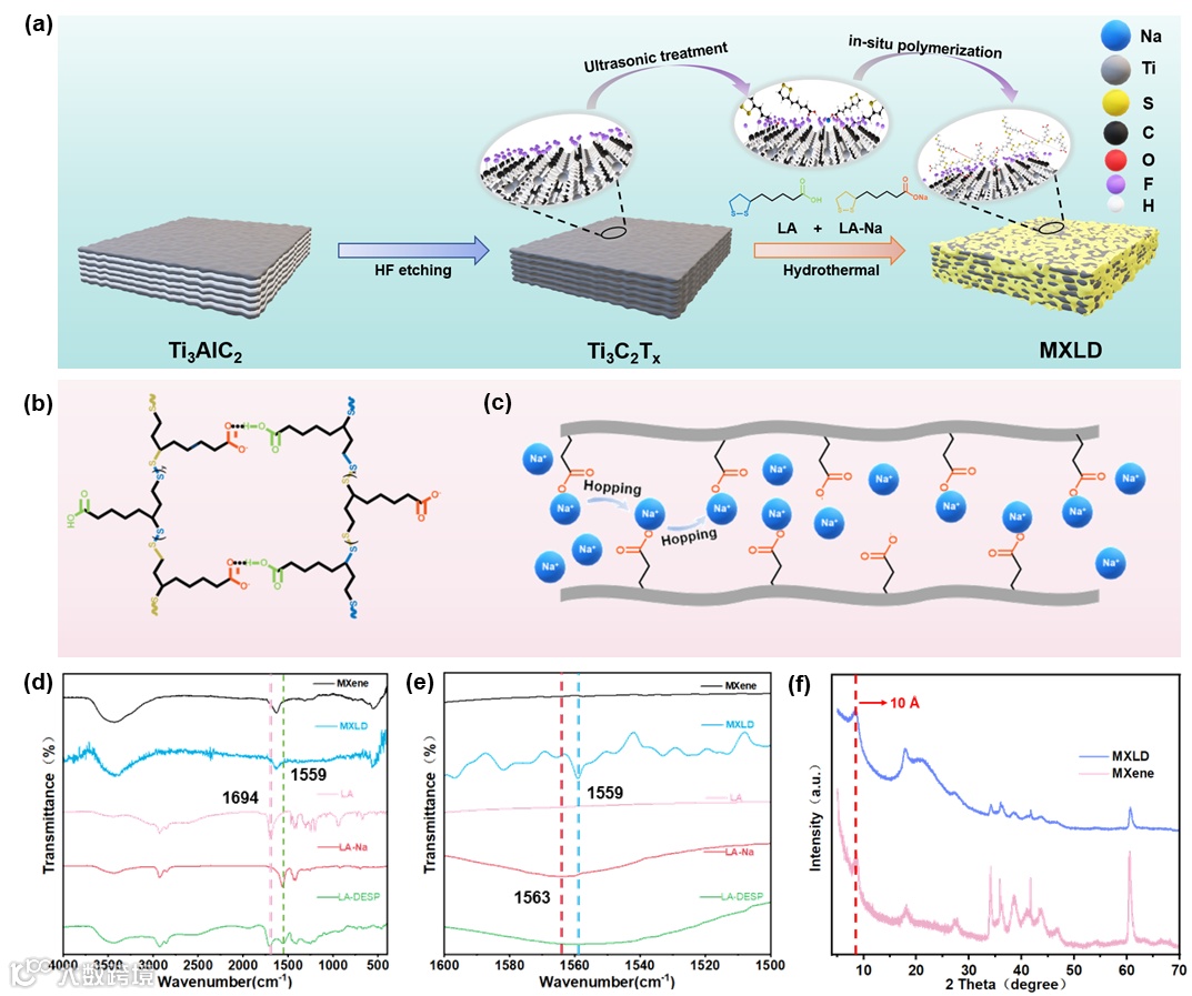 基于此,大连理工大学胡方圆教授近日在Advanced Functional Materials上发表题为“Construction of Ti3C2Tx MXene with Hopping Migration Mechanism via Deep Eutectic Supramolecular Polymers Anode for Sodium Ion Batteries”的研究型论文。该工作基于硫辛酸和硫辛酸钠之间的深共晶效应,创制出深共晶超分子聚合物包覆Ti3C2Tx MXene(MXLD)钠离子电池负极材料,阐明了超分子聚合物促进Na+跳跃迁移新机制,改善了Na+传输动力学过程。硫辛酸/硫辛酸钠深共晶超分子聚合物(LA-DESP)中丰富的羧基和酯基可提供高粘附力,并通过原位固化能力可有效增强其机械强度,同时还可提供额外的Na+存储位点。此外,链段上丰富的−COOH和−COO−活性基团可促进Na+传输动力学过程,提高了Na+传输速率,并阐明了Na+基于LA-DESP传输通道的跳跃迁移新机制。该工作基于深共晶效应,构建了聚合物包覆Ti3C2Tx MXene的钠离子电池负极材料,为聚合物基电化学能源材料应用提供了新思路。