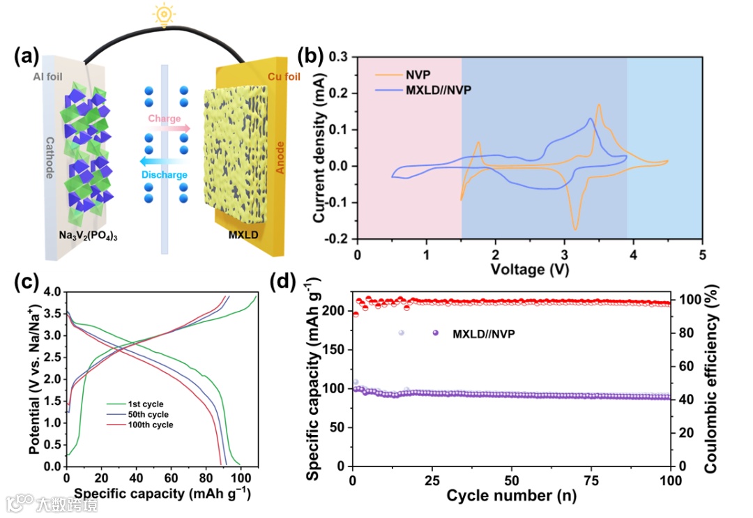 图7. MXLD//NVP全电池的性能。(a) MXLD//NVP全电池示意图。(b) MXLD//NVP全电池在0.2 mV s-1循环伏安曲线图。(c) 全电池恒电流充放电曲线图。(d) MXLD//NVP全电池在500 mA g-1下循环性能测试图。