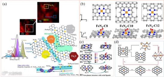 图3. Fe-N-C活性位点类型(a);不同周围碳原子形成的Fe-N4活性位点(b);Fe-N动态结构是由Fe2+/Fe3+的氧化还原转变引起的(c);D1和D2活性位受电位跃迁影响的动态演化过程(d)。