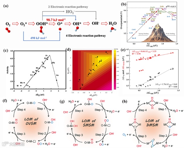 图1. ORR反应过程示意图(a);不同金属卤化物ORR活性的火山图(b);根据Nørskov(c-d)的研究,绘制了各种金属的火山图;∆GOOH*与∆GOH*的线性关系(e)三种新的LOM机制机理图(f)。
