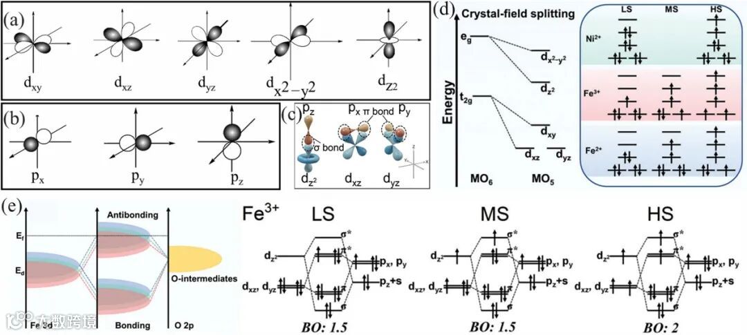 图2. d轨道方向(a);p轨道取向(b);不同的轨道键合图(c);不同金属的电子排布状态和同一金属的不同价态在d轨道能量处受晶体场的影响发生分裂的示意图(d);Fe 3d轨道和O 2p轨道的成键图(e)。