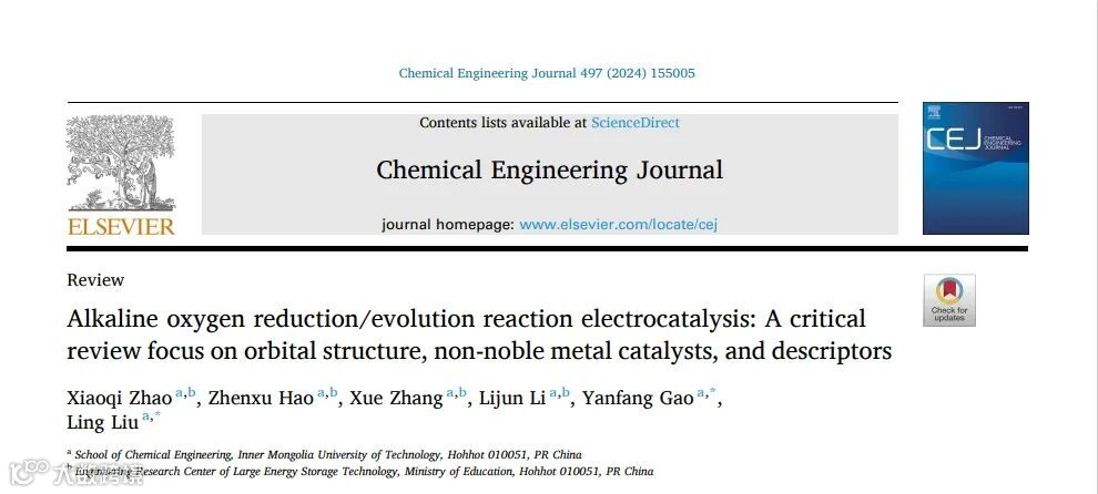 近日,来自内蒙古工业大学的高艳芳教授、刘玲讲师在国际知名期刊Chemical Engineering Journal(IF:13.34)上发表题为“Alkaline Oxygen Reduction/Evolution Reaction Electrocatalysis: A Critical Review Focus on Orbital Structure, Non-Noble Metal Catalysts, and Descriptors”的文章。该文章总结了TM基纳米材料催化氧还原反应/析氧反应中间体过程中轨道结构的变化及其控制措施,讨论了各种TM基活性位点,并展示了氧还原反应/析氧反应活性描述符。此外,对近年来基于HB相互作用提高氧还原反应/析氧反应活性的研究工作进行了汇总。