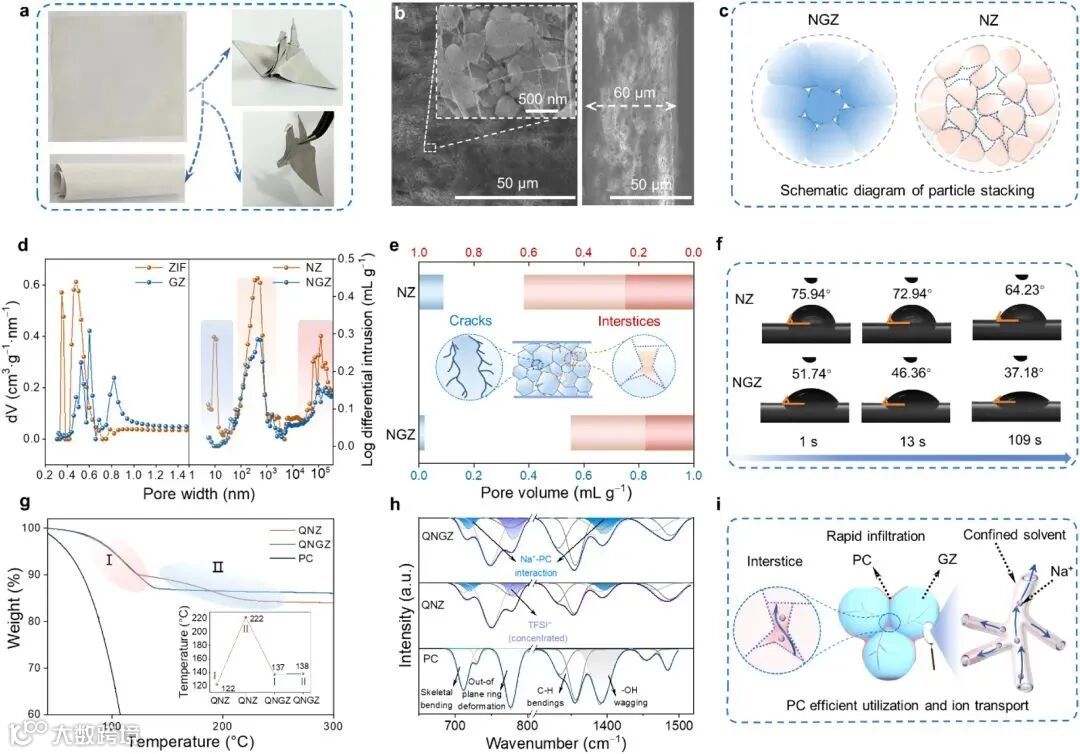 通过卷对卷辊压策略制备了基于GZ/ZIF的自支撑膜,并通过SEM和压汞测试(MIP)表征了薄膜的形貌和的孔隙分布。结果显示,GZ膜且具有分级的孔道结构和低的孔隙率,且表面更为致密,这有利于抵制枝晶的生长。热重分析(TGA)表明QSSEs中PC溶剂的分解温度大大提高,且分解速率也降低,表明溶剂与膜骨架之间存在强相互作用,QSSEs高的热稳定性有利于拓宽其工作温度范围和电化学窗口。此外,循环后的QNGZ红外光谱,表明其内部少量PC溶剂表现出更强的Na+-PC相互作用,QNGZ分级通道中PC溶剂的功能分布和高效利用,归因于间隙互连Na+-PC网络和仿生血管通道,这有利于降低电极/电解质界面阻抗,促进Na+快速传输。因此,QNGZ在30 °C下的离子电导率高达1.18×10-4 S cm-1,且表现出较低的极化电位和更稳定的Na沉积/剥离行为。