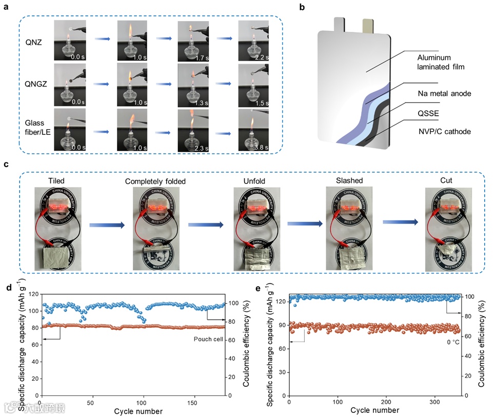 将QNGZ应用于Na||Na3V2(PO4)3/C(NVP/C)电池。Na|QNGZ|NVP/C电池在1C电流密度下经过500次循环后,每次循环的容量衰减率仅为0.0288%。此外,由于其结构对PC的物理通道及化学限域,QNGZ膜表现出优异的阻燃性能。同时,Na|QNGZ|NVP/C软包电池能够使LED设备在不同弯曲和破坏条件下均能正常工作,证明了QNGZ良好的柔韧性和准固态钠离子电池的安全特性。此外,Na|QNGZ|NVP/C电池在0.2 C和0 °C测试条件下经过180次循环后,仍能保持81.4 mAh g-1,证实了QNGZ在低温下的优异循环稳定性和良好界面兼容性。