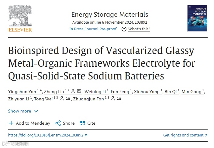 近日,来自中国石油大学(华东)范壮军教授、扬州大学刘征博士(共同通讯作者)等人,在国际知名期刊Energy Storage Materials上发表题为“Bioinspired design of vascularized glassy metal-organic frameworks electrolyte for quasi-solid-state sodium batteries”的观点文章。受生物血管中离子传输启发,该文章设计了一种仿生血管化玻璃态金属有机框架(MOF)准固态电解质,其具有各向同性、多级离子传输通道及氮空位活性位点等特性,实现了少量溶剂在宏观和微观环境中合理分布及高效利用,显著提高了钠离子的传输效率和电极/电解质界面稳定性。该电解质在Na||Na3V2(PO4)3/C电池中展现了优异的倍率性能和长期循环稳定性。这项研究为开发高性能固态钠电池提供了新的思路。