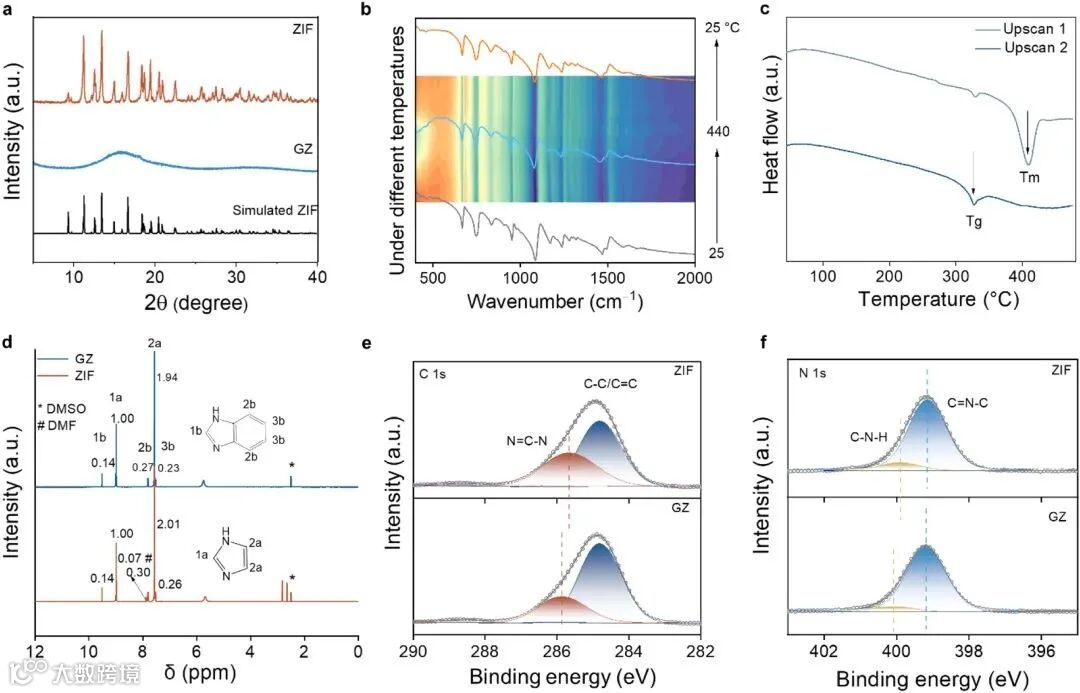 首先通过溶剂热法合成了ZIF材料,并通过高温熔融淬火处理将其转变为玻璃态GZ。通过X射线衍射(XRD)、傅里叶变换红外光谱(FT-IR)和差示扫描量热法(DSC)等表征手段,说明GZ具有无晶界和各向同性的特性。利用电子顺磁共振(EPR)分析和热重质谱(TG-MS)揭示了GZ中N空位的形成。密度泛函理论(DFT)进一步计算了GZ中钠离子传输路径,结合静电势(ESP),揭示了GZ活性位点对钠离子传输的促进作用。