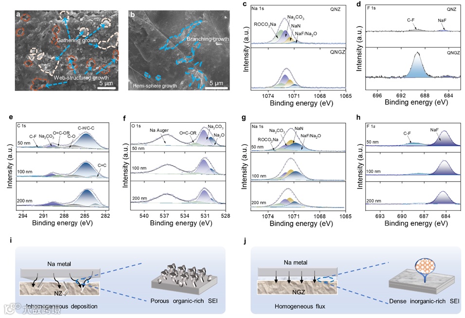 Na|QNGZ|Na对称电池中的钠沉积则呈现出半球状,这种沉积方式有助于消除内部应力并保持界面的稳定性。通过X射线光电子能谱(XPS)分析,发现QNGZ固体电解质界面(SEI)层含有更高比例的无机物,这使得SEI层更加稳定。在Ar+溅射不同深度下的XPS谱图,表明QNGZ能够引导形成致密的无机SEI层,有效抑制枝晶的生长。而Na|QNZ|Na对称电池中Na金属表面SEI层多孔且脆弱,无法有效抑制不均匀钠枝晶的生长并及时释放伴随的内部应力/应变,最终会导致电池短路。QNGZ的均匀分布活性位点和稳定的玻璃态结构及其各向同性特性能够均质化界面传输的钠离子通量,从而促进致密SEI的形成,实现均匀的Na沉积/剥离,进而提升电池的循环稳定性。