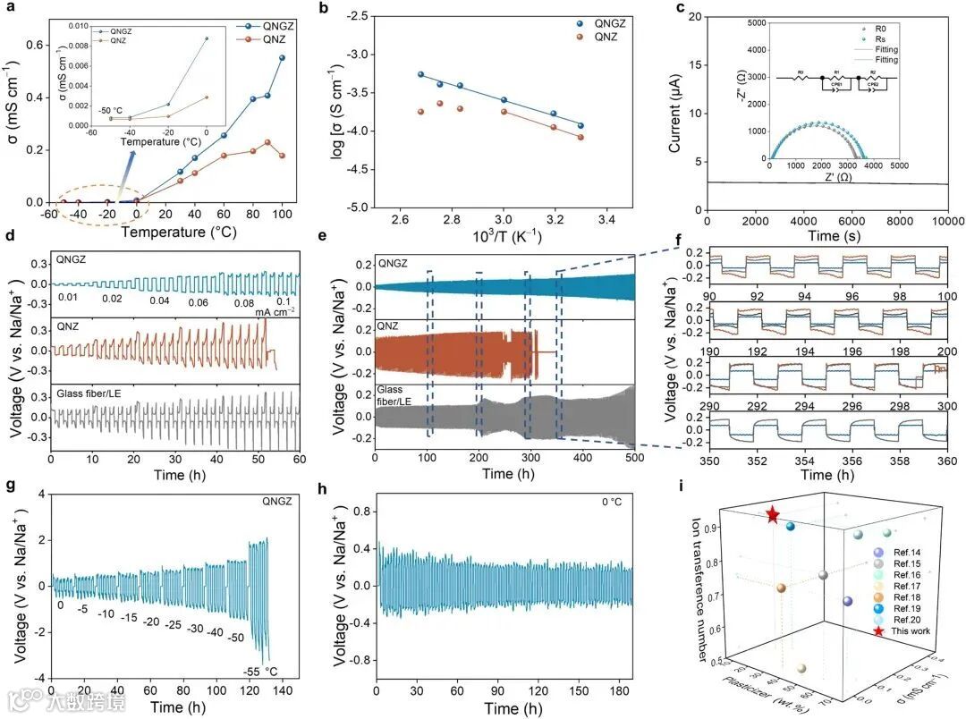 图5. QSSE的Na+传导特性和Na沉积/剥离曲线