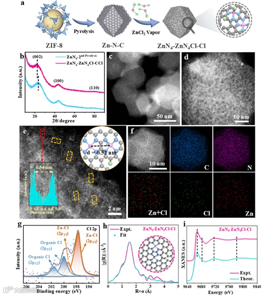 首先通过经ZIF-8热解制备Zn-N-C材料,其随后在ZnCl2气氛中进一步热处理,得到ZnN4-ZnN4Cl-Cl。无ZnCl2气氛仅二次热处理得到的材料记为ZnN4-2ndpyrolysis ,作为对照样。XRD、Raman和HAADF-STEM分析表明,ZnN4-ZnN4Cl-Cl具有更丰富的碳微孔和更大的碳层间距。HAADF-STEM和EXAFS确认Zn的单原子分散状态。EXAFS拟合推导出ZnN4-ZnN4Cl-Cl位点结构(见图3h插入图),将其进行XANES光谱理论模拟,理论XANES谱和实验谱一致,证明ZnN4-ZnN4Cl-Cl位点结构的合理性。同时,EXAFS拟合结果表明ZnN4-ZnN4Cl-Cl中ZnN4的Zn-N键较短,共价性强,能有效抑制脱金属化,提升ORR耐久性。