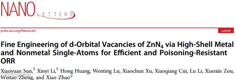 近日,来自吉林大学的赵晓教授,在国际知名期刊Nano Letters上发表题为“Fine Engineering of d‑Orbital Vacancies of ZnN4via High-Shell Metal and Nonmetal Single-Atoms for Efficient and Poisoning-Resistant ORR”的研究论文。该论文通过理论计算筛选出调节ZnN4的d轨道空缺度的高壳层配位原子,并通过实验制备了目标催化剂(ZnN4-ZnN4Cl-Cl),相对于原始ZnN4而言,其ORR活性大幅提高,半波电位由0.822 VRHE提升到0.912 VRHE,10000次电位循环后,活性几乎无损失,且对SCN-毒化具有极高的抵抗力。