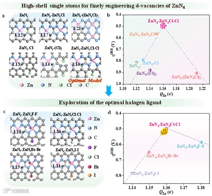 DFT计算表明,简单引入强吸电子的轴向-Cl配体虽然能增加ZnN4的d轨道空缺度,但也会导致Zn脱离碳平面,造成ZnN4Cl难以吸附-OH中间体,不能作为活性位点。为精细调控ZnN4的d轨道空位,我们引入高壳层配位的ZnN4Cl和碳空位边缘-Cl基序(简写为-Cl),实现了灵活的d轨道空位调节。理论计算表明ZnN4-ZnN4Cl-Cl具有最低ORR过电势。进一步改变卤素(F、Cl、Br、I)配体种类,发现ZnN4-ZnN4Cl-Cl因具有适中的d轨道空位度而显示出最佳的ORR催化性能。