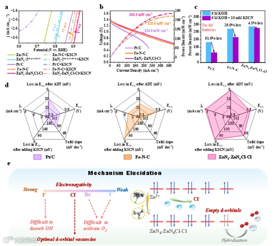 ZnN4-ZnN4Cl-Cl在半电池与锌空电池中均表现出高的抗毒化能力。添加10 mM KSCN(强毒化剂)进入电解质溶液后,ZnN4-ZnN4Cl-Cl的E1/2仅损失3 mV,最大功率密度仅损失4.1%,远优于Pt/C和Fe-N-C催化剂。