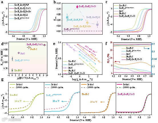 ZnN4-ZnN4Cl-Cl的ORR性能优异,半波电位(E1/2)达到0.912 VRHE,优于Zn-N-C、Fe-N-C和商用Pt/C对照样。在0.90 VRHE E时,其TOF值为1.54 e⁻ site⁻¹ s⁻¹, 远超过ZnN4-2ndpyrolysis的0.003 e⁻ site⁻¹ s⁻¹。此外,ZnN4-ZnN4Cl-Cl显示出几乎100%的四电子选择性,H₂O₂产率极低。耐久性测试表明ZnN4-ZnN4Cl-Cl经过10,000个电势循环后E1/2几乎无损失。