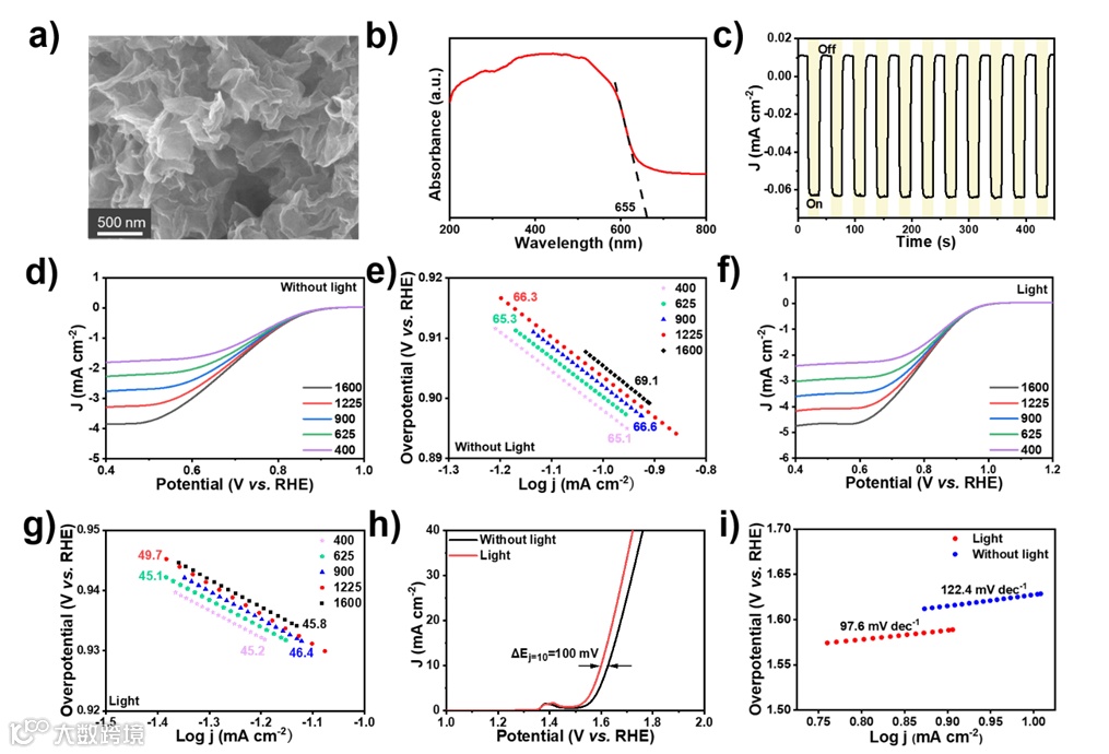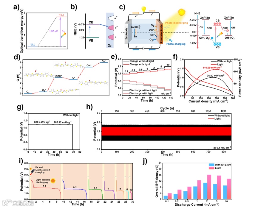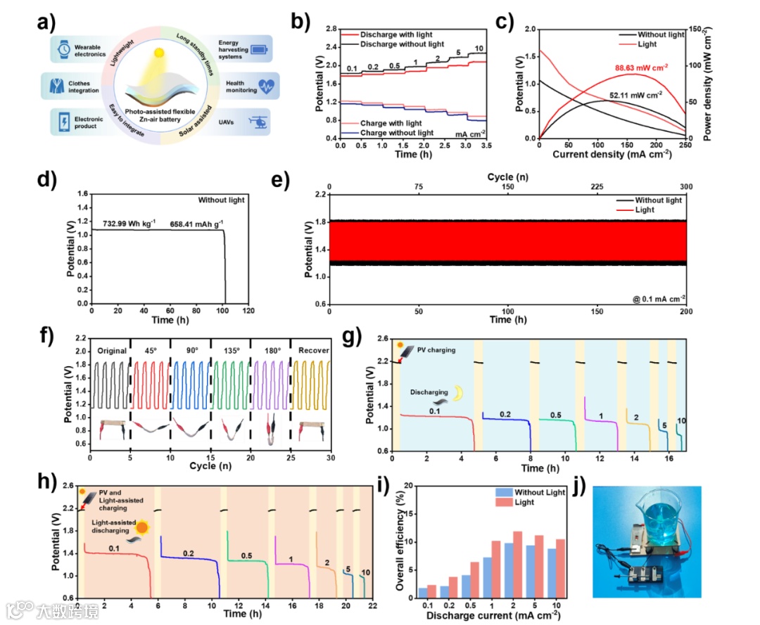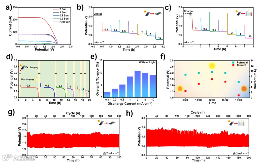 图3. 光辅助pTTh阴极工作机理与太阳能自供电光辅助水系RZABs系统性能测试