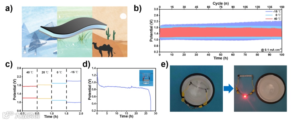为了满足电子设备的实际供电需求,太阳能自供电RZABs系统必须能够在宽温域以及恶劣天气下运行。组装的FRZABs能够在-15至40 °C温度范围内稳定充放电循环100 h。此外,将FRZABs浸入生活用水中,FRZABs能以0.9 V稳定放电28 h。