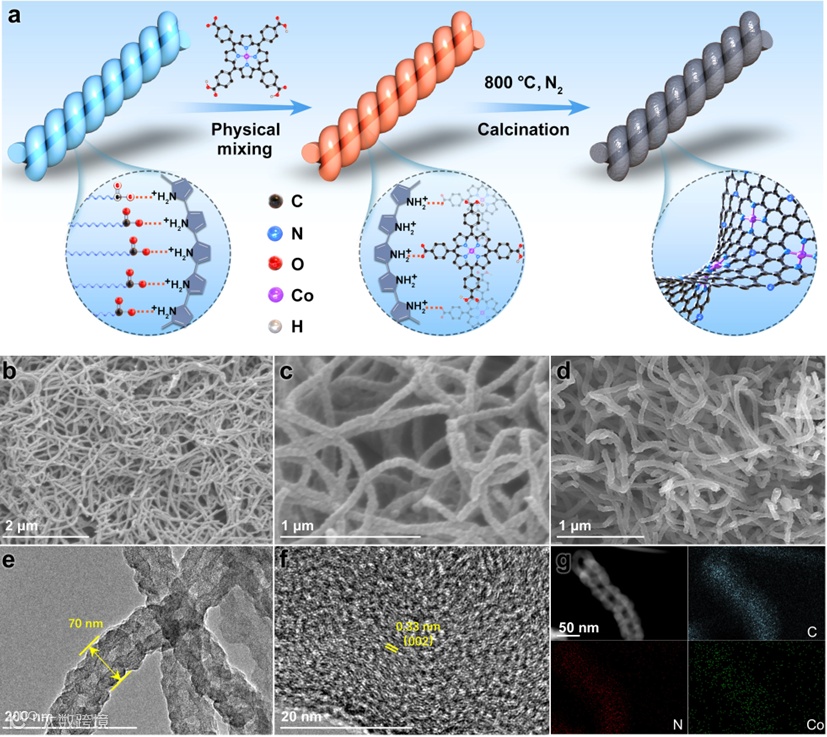 图1(a)Co-N-C@HCNT的合成路线图。螺旋PPys(b,c)和Co-N-C@HCNT(d)的SEM图像。Co-N-C@HCNT的(e)TEM图像、(f)HRTEM图像、(g)HAADF-STEM图像以及相应的C、N和Co元素分布图。