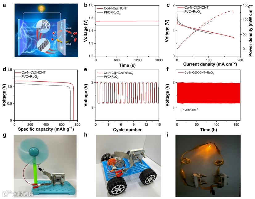 图4(a)可充电的锌空气电池示意图。Co-N-C@HCNT以及Pt/C+RuO2的(b)开路电压,(c)放电极化曲线和功率密度曲线,以及(d)j = 20.0 mA cm−2时的放电曲线。(e)Co-N-C@HCNT+RuO2在j = 2.0 mA cm−2下测量的锌空气电池的放电-充电循环数据和(f)长时间循环测试。(g)Co-N-C@HCNT驱动的玩具风扇、(h)玩具车和(i)发光二极管(LED)的图片。