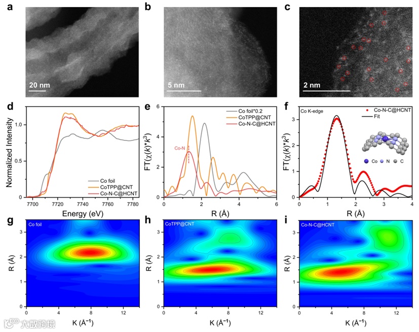 图2(a-c)Co-N-C@HCNT的球差校正HAADF-STEM图像。(d)归一化Co K边XANES和(e)k3-加权 FT-EXAFS光谱(无相位校正),包括Co-N-C@HCNT,Co箔,以及CoTPP@CNT.(f)Co-N-C@HCNT R空间Co K边k3-加权 FT-EXAFS拟合曲线。Co K边WT-EXAFS图:Co箔(g),CoTPP@CNT(h)以及Co-N-C@HCNT(i)。