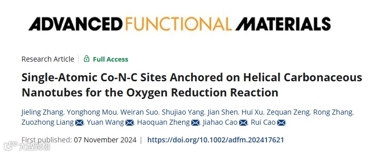 近日,陕西师范大学曹睿教授团队在国际知名期刊Advanced Functional Materials上发表题为“Single-Atomic Co-N-C Sites Anchored on Helical Carbonaceous Nanotubes for the Oxygen Reduction Reaction”的文章。该文章Co-N-C@HCNT材料以金属卟啉和螺旋聚吡咯为前驱体,采用一步热解法制备了具有弯曲结构的材料,与没有螺旋结构的Co-N-C@CNT相比,Co-N-C@HCNT表现出优异的电催化ORR活性和稳定性。