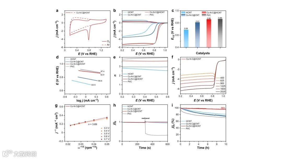 图3(a)Co-N-C@HCNT在Ar和O2饱和的0.1M KOH溶液中测量的CV数据。(b)ORR LSV数据,(c)E1/2的比较,(d)塔菲尔斜率,(e)计算的n值,(h)耐甲醇试验,以及(i)在O2饱和的0.1 M KOH中以1600 rpm测量的HCNT,Co-N-C@CN,Co-N-C@HCNT和Pt/C的稳定性试验。(f)Co-N-C@HCNT在不同转速下的ORR LSV数据和(g)K-L图。