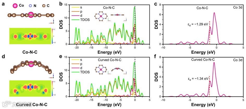 图5 Co-N-C(a-c)和弯曲Co-N-C(d-f)的结构模型和差分电荷密度图(a,d),DOS图(b,e),以及d带中心(d-f)。