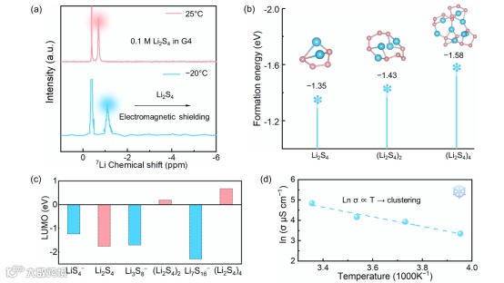 图1. 低温下多硫化锂的团簇化及其对电化学和传输特性的影响。(a) 25 至 −20℃ 的 7Li 核磁谱。(b) 代表性[Li2S4]n 团簇的形成能。(c) 带电和不带电 LiPS 物种的 LUMO 能级。(d) 0.1 M Li2S4电解液从室温到低温的离子电导率。