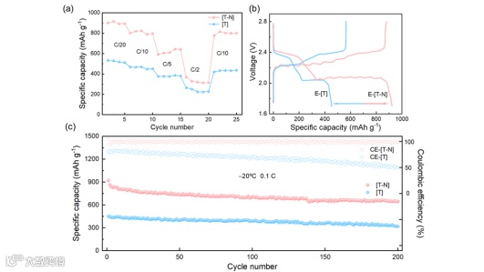图4. 锂硫电池在 −20℃ 下的电化学性能。(a) 倍率性能 (b) 充放电曲线,以及 (c) 循环性能。