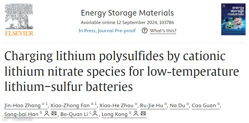阳离子硝酸锂物种促进多硫化物带电,削弱低温下硫物种团簇,提升锂硫电池低温动力学